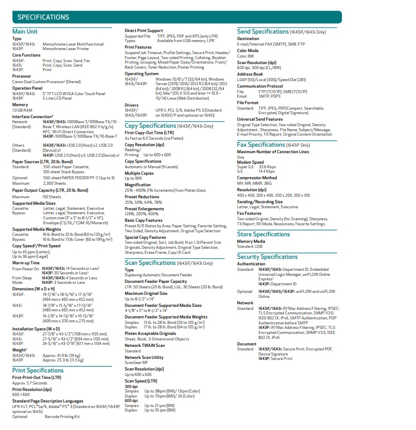 | Package Contents | -Main unit: imageRUNNER 1643i II multifunction printer.