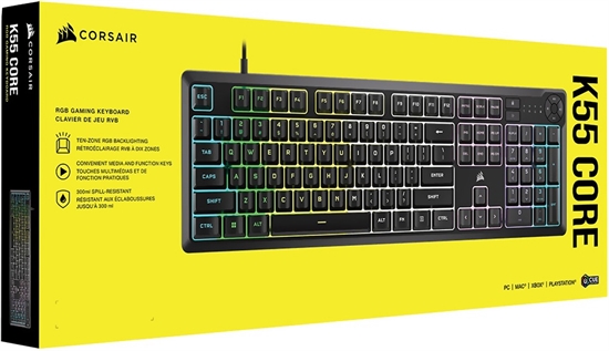 The CORSAIR K55 CORE RGB Gaming Keyboard offers a full-size layout with quiet, responsive membrane keys and ten-zone customizable RGB backlighting. Equipped with dedicated media controls and spill resistance up to 300ml, it's designed for gamers seeking reliability and style. Compatible with CORSAIR iCUE software for personalized lighting effects.