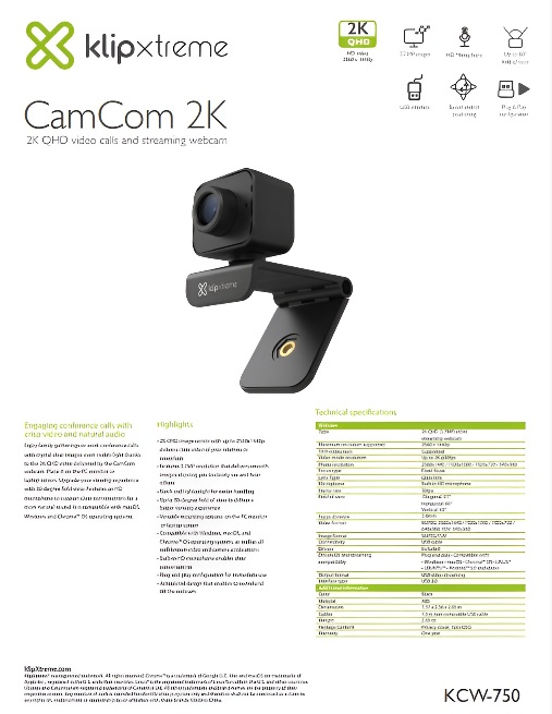 | Contenido del Paquete | 1 × Webcam Klip Xtreme CamCom 2K (KWC750)