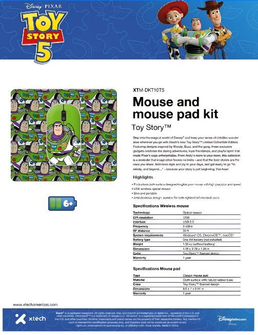 Kit inalámbrico Xtech XTM-DKT10TS con mouse óptico y mouse pad con diseño de Toy Story. Conexión 2.4 GHz estable, receptor USB plug & play y diseño compacto ambidiestro. Ideal para uso diario en casa, oficina o estudio.